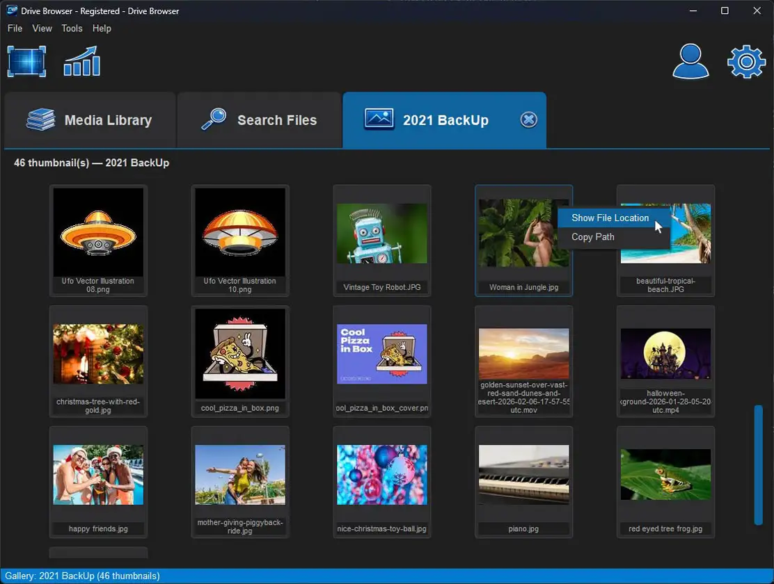 Browse your photos and video thumbnails in a scrollable visual grid per drive.