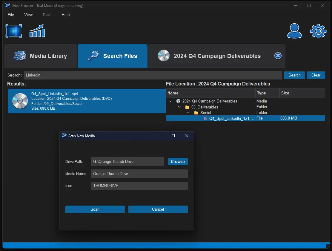 Scan and catalog internal and external drives so you can find anything fast - even when disconnected!